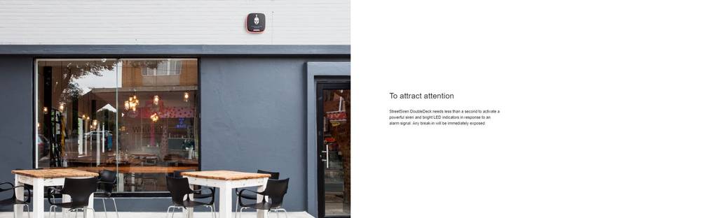 • StreetSiren DoubleDeck needs less than a second to activate a powerful siren and bright LED indicators in response to an alarm signal. Any break-in will be immediately exposed