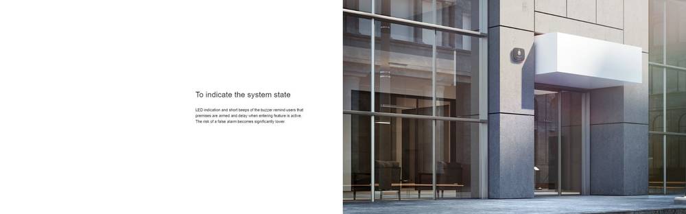 • LED indication and short beeps of the buzzer remind users that premises are armed and delay when entering feature is active. The risk of a false alarm becomes significantly lower