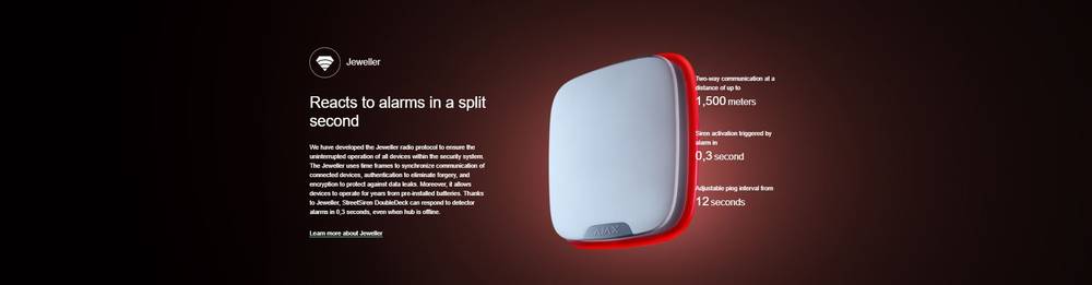 • We have developed the Jeweller radio protocol to ensure the uninterrupted operation of all devices within the security system. The Jeweller uses time frames to synchronize communication of connected devices, authentication to eliminate forgery, and encryption to protect against data leaks. Moreover, it allows devices to operate for years from pre-installed batteries. Thanks to Jeweller, StreetSiren DoubleDeck can respond to detector alarms in 0,3 seconds, even when hub is offline