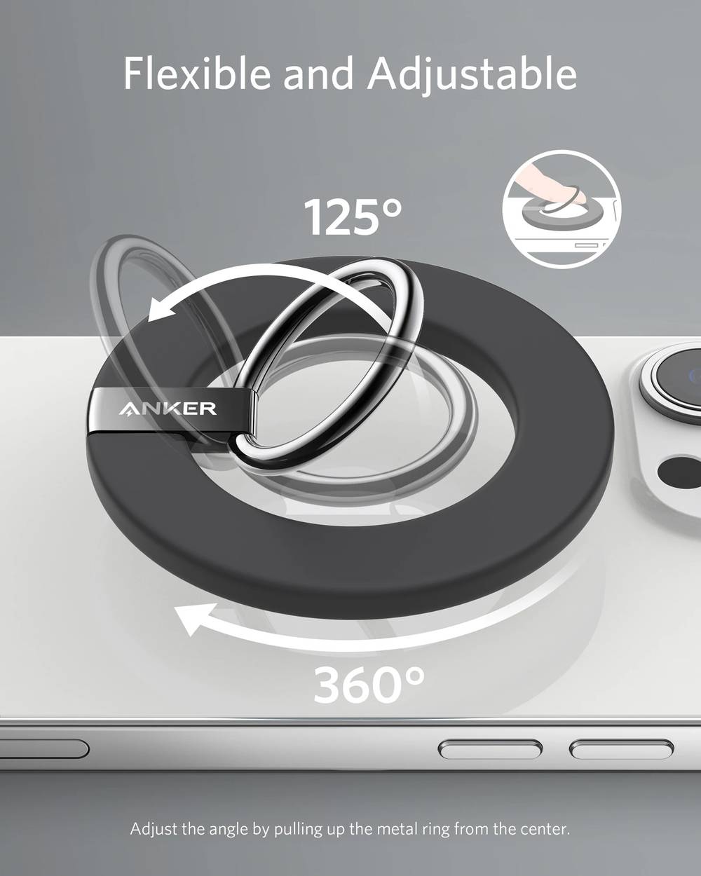 - The Right Angle: Easily rotate your ring holder 360° and flip it up to 125° for a comfortable grip or different viewing positions when placed on a tabletop.