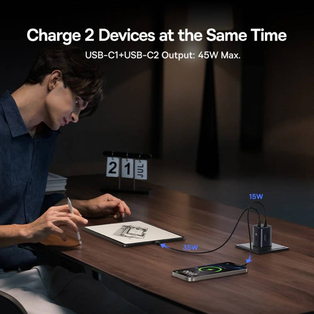 • Smaller Size, Higher Portability The Baseus 45W USB-C charger with 2 ports features a high-density built-in design and is 54% smaller than traditional 30W chargers. It fits easily in bags or carry-on luggage and does not block adjacent sockets. An ideal companion for business trips.