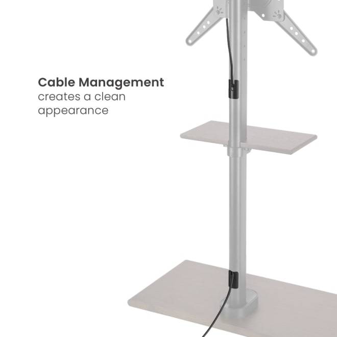 The FS41-44T-02 is an attractive, free-standing floor stand for your TVs. Simple design is characterized by easy usage. This sleek, stable steel base stand, fits well in any room, even in compact spaces. The TV floor stand takes up less area and opens up your space. The TV stand has a matte black finish on the shaft with cable management to hide the messy cable, making your room clean and tidy. 6 adjustable height adjustments that make your TVs always at eye level for a better view. With the storage shelf, you can place the CDS, remotes, or other needed items on it.