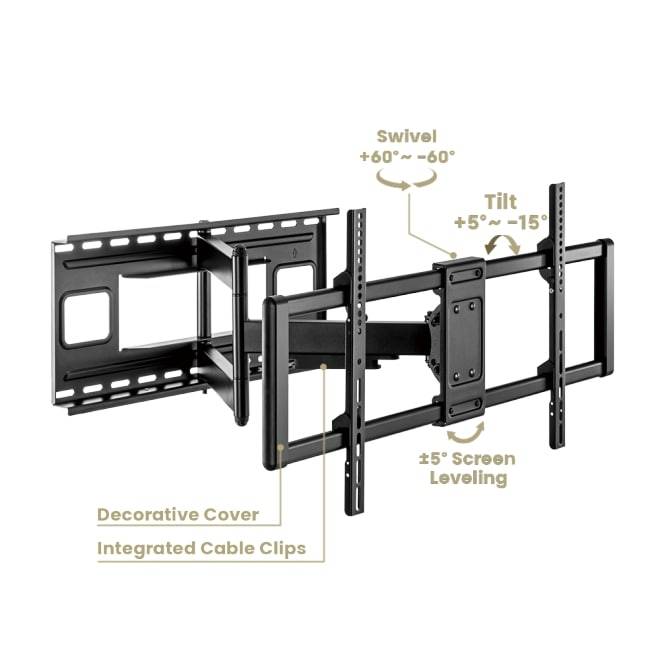 Heavy-duty arms provide strong support for larger and heavier TVs up to 80kg,it basically holds all types of TVs from 43”-90” . TV installation and removal are made easy through a unique quick-release mechanism. Toolless tilting delivers optimal viewing angles. Integrated cable management creates a clean appearance.