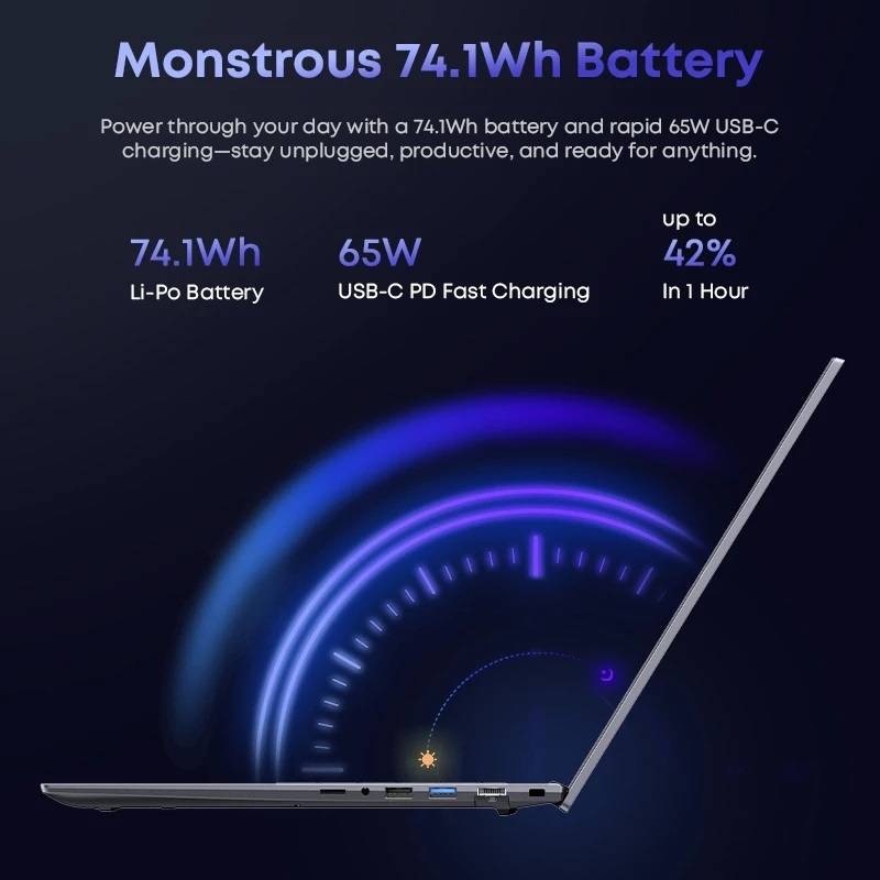 - Long-lasting Battery Life The built-in 74.1Wh high-capacity battery keeps up with a full day of work or study. Fast charging allows for on-the-go replenishment.