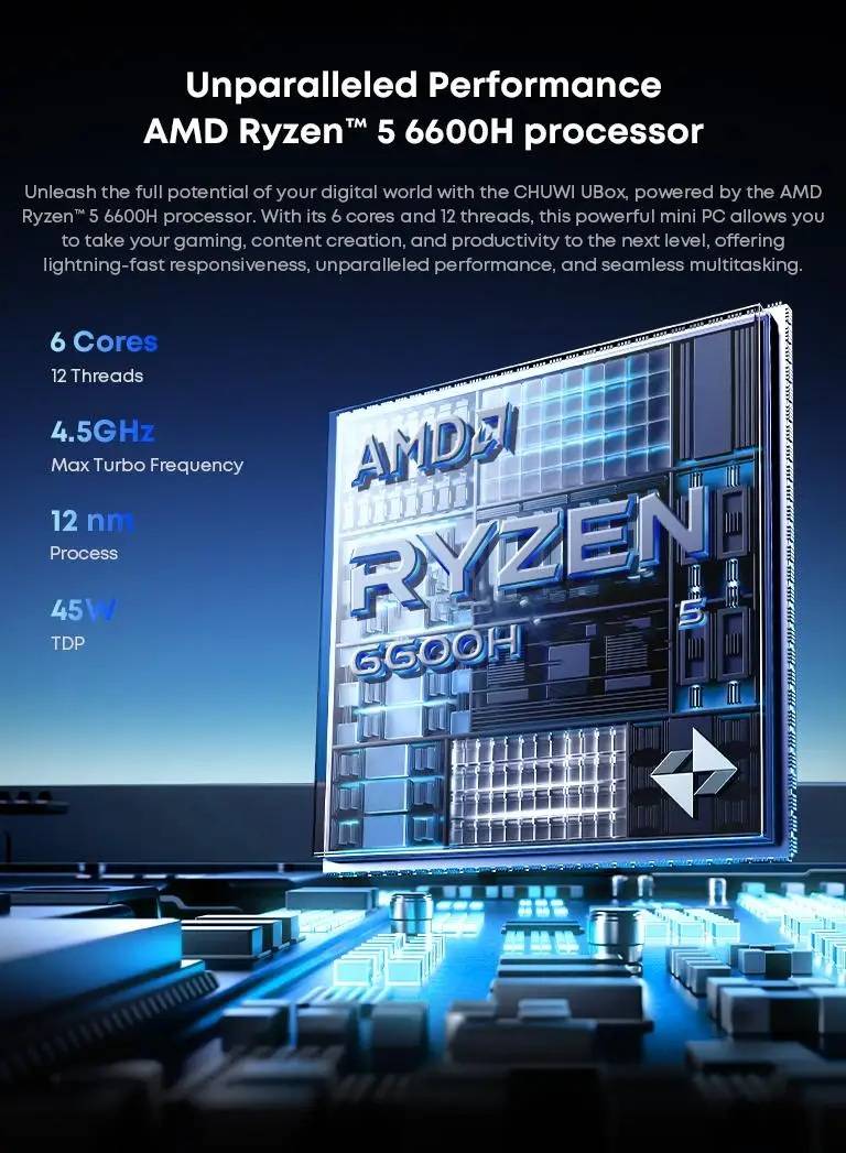 - Unparalleled Performance AMD Ryzen 5 6600H processor Unleash the full potential of your digital world with the CHUWI UBox, powered by the AMD Ryzen" 5 6600H processor. With its 6 cores and 12 threads, this powerful mini PC allows you to take your gaming, content creation, and productivity to the next level, offering lightning-fast responsiveness, unparalleled performance, and seamless multitasking