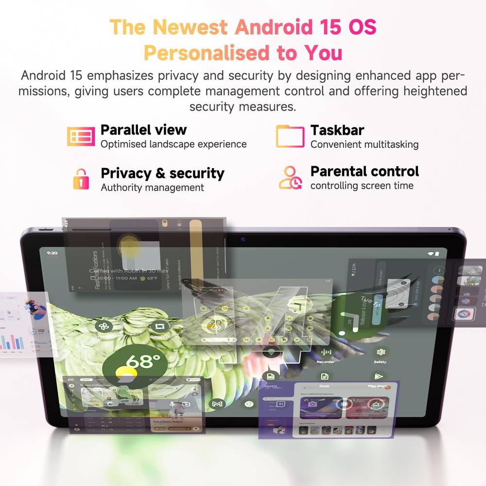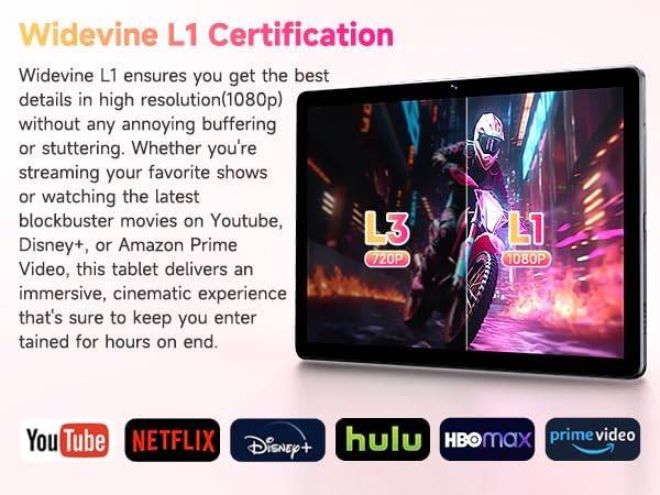 - 8GB+128GB Storage & Widevine L1 This Android 15 tablet comes with 8(4+4 virtual) RAM & 128GB ROM, it easily expands to 1TB with a MicroSD card for storing photos, music, and videos without worrying about the space. This android tablet supports Widevine L1 & GPS function, which allows you to smoothly stream HD video on Netflix, Prime Video, Disney+, Hulu, Amazon Prime Video, etc.