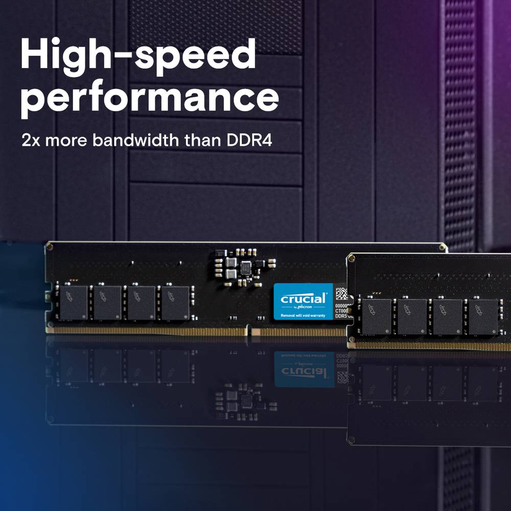 Crucial DDR5 Desktop Memory can empower your computer to transfer 50% more data than DDR4 at launch, resulting in faster load times, file transfers, downloads, refresh rates and less lag time.