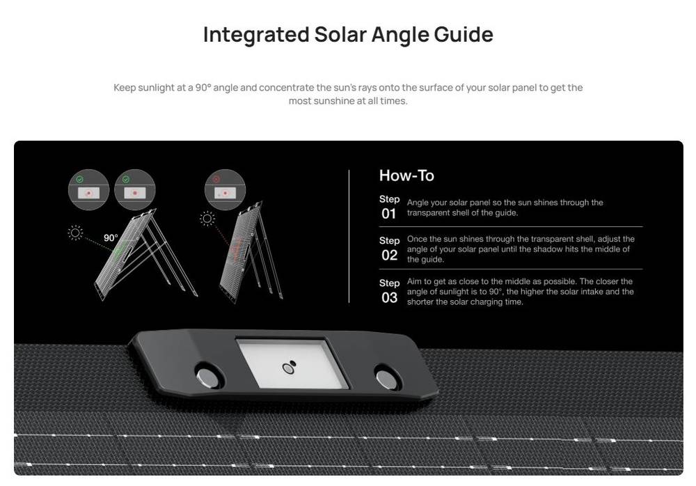 • 3-angle (30°/45°/60°) adjustable stand and integrated solar angle guide
