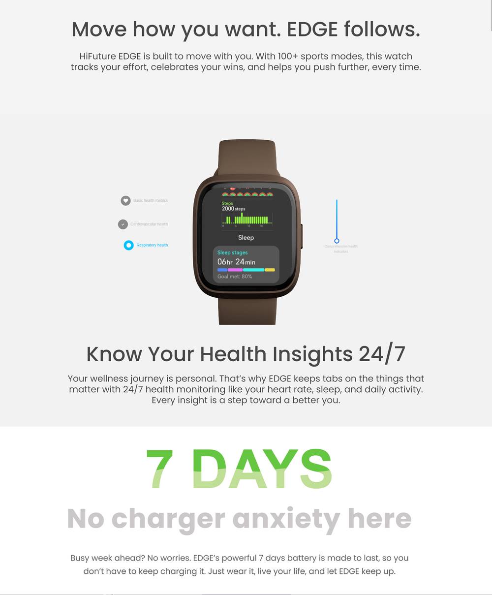 • EDGE follows: HiFuture EDGE is built to move with you. With 100+ sports modes, this watch tracks your effort, celebrates your wins, and helps you push further, every time.