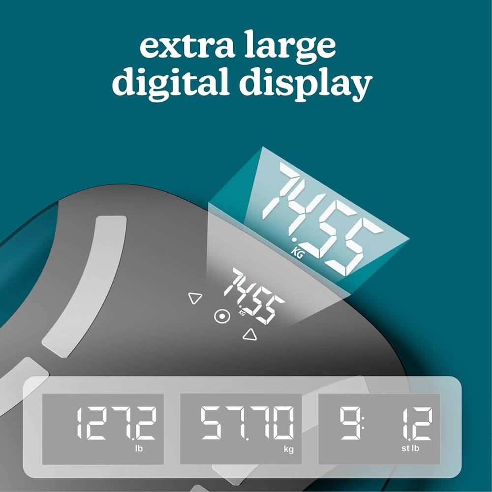 HIGH CAPACITY & VERSATILITY: With a 400lb/180kg capacity, this body weight scale offers precise measurements as body composition scales & body fat monitors, displaying results in your choice of kg, st:lb or lb units. Powered by 3x AAA batteries (included)