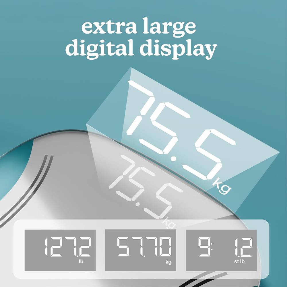 SIMPLE OPERATION: With an auto on/off functionality, simply step on for instant measurements. The extra large 95x55mm display screen and 44mm white LED digits provide easily visible readings even in dim lighting. Powered by 3 x AAA batteries (included)