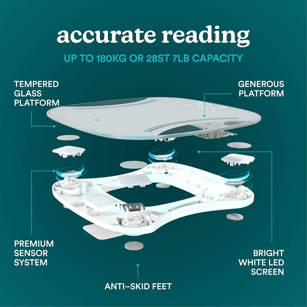 PRECISE DIGITAL BATHROOM SCALES: Four finely-tuned, pre-calibrated metal load cells identify even the smallest changes in weight in 0.1kg/0.1lb increments up to 180kg, providing precise, reliable bathroom scale readings that you can trust