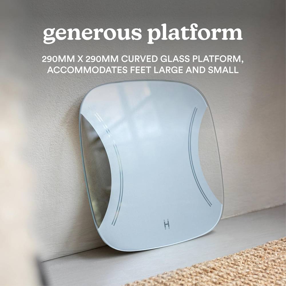 STRONG & SCRATCH-RESISTANT: These digital scales feature 5mm scratch resistant tempered safety glass for strength and durability. The 290x290mm curved glass surface and anti-skid feet provide stable footing while protecting your bathroom floor
