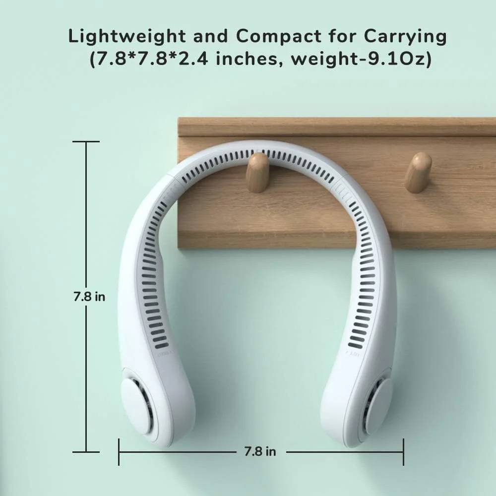 - Compact Design Personal neck fans weigh about 9.1OZ and are ultra-light, putting less strain on the neck.When using the fan, you don't have to worry about your hair getting caught on the fan blades.