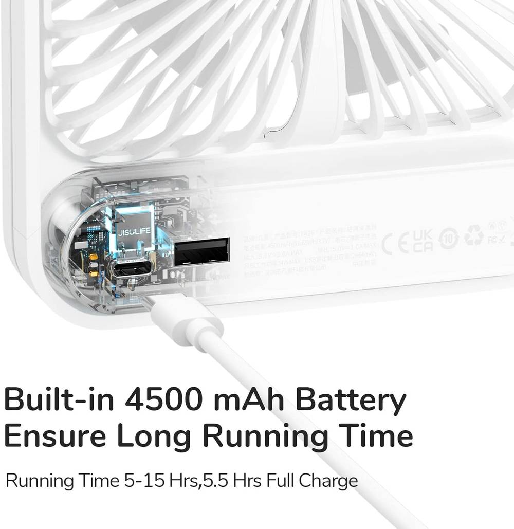 • Cordless and Rechargeable This desktop fan has a built-in 4500 mAh energy-saving battery, which is not anxious for going out. And it is equipped with a USB interface, can be used as a power bank in an emergency as well.