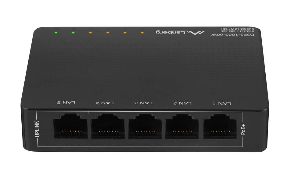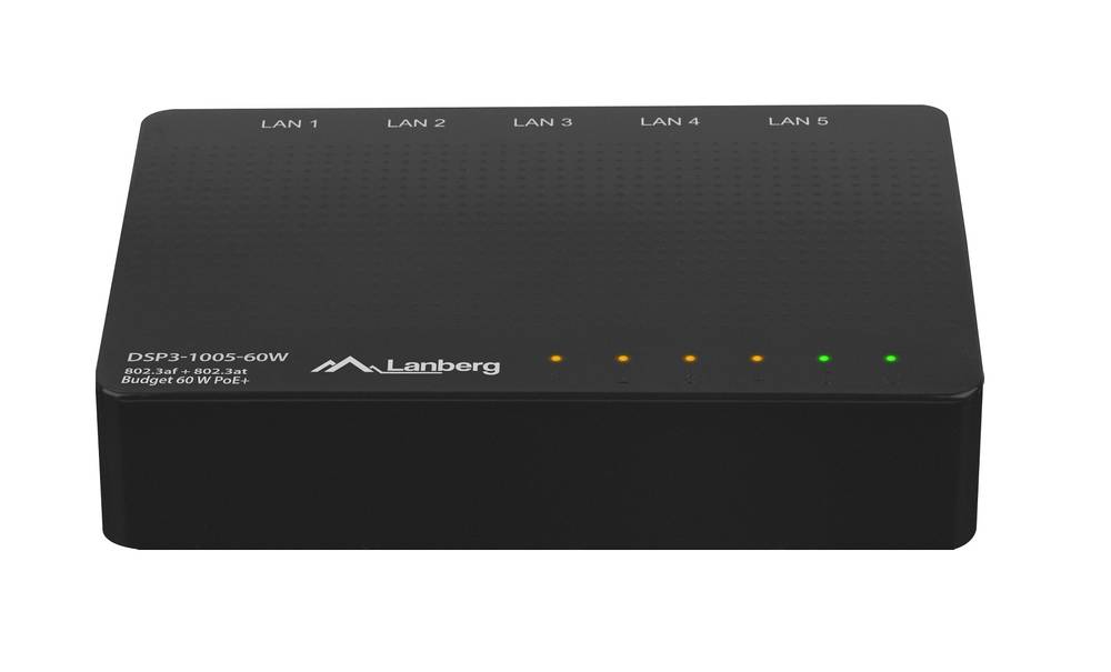 Lanberg DSP3-1005-60W is an unmanaged, compact, desktop PoE+ switch with 5 Gigabit Ethernet ports, including 4 PoE ports with a 60W PoE budget for powered end-devices. This convenient active networking product operates using Plug-and-Play technology. DSP3-1005-60W provides switching support for 5 RJ-45 10/100/1000 Mbps ports with automatic connection negotiation and MDI-MDIX support.