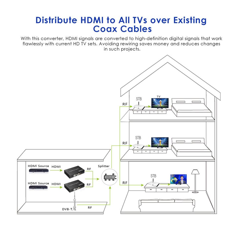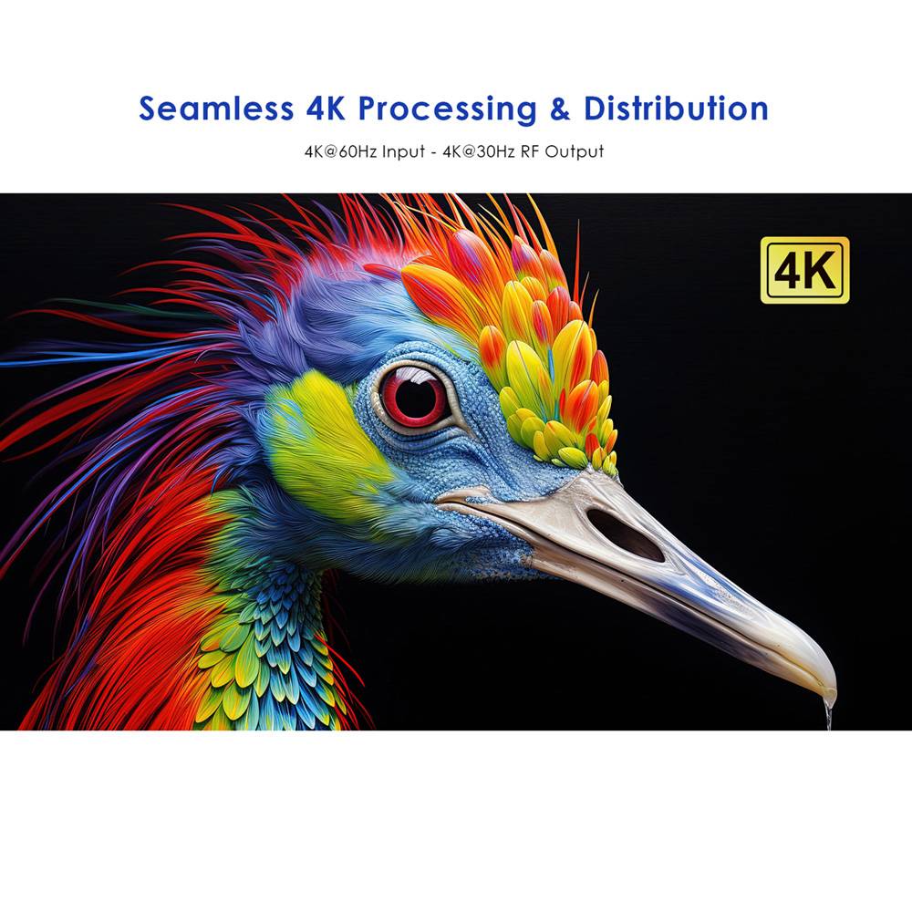 - Advanced 4K Distribution: Encodes 4K@30Hz HDMI signals into DVB-T RF for seamless transmission over standard coax.