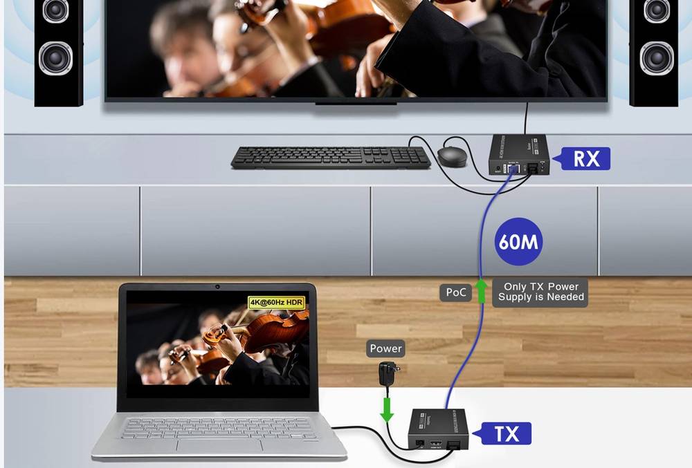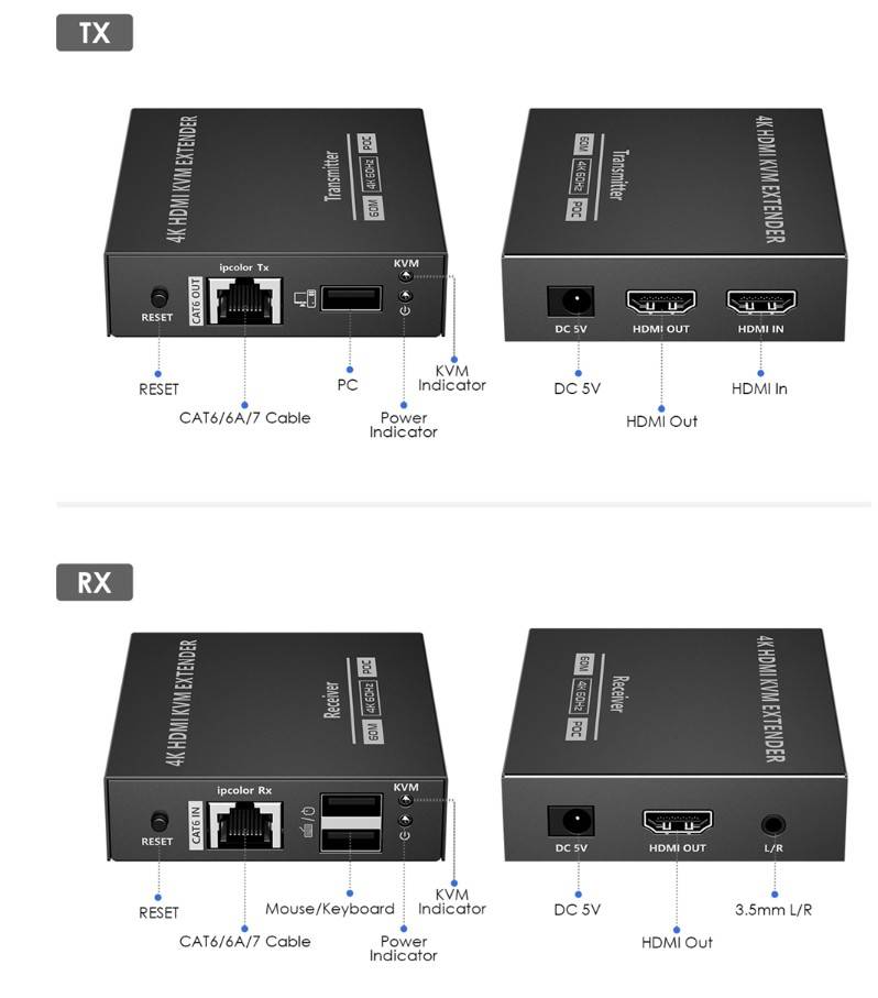 This is an HDMI point-to-point extender kit, it can realize zero-latency transmission. The 4K@60Hz HDMI signal can be extended by 60m through CAT6/6A/7 network cable. It supports HDMI loop out, KVM function, 3.5mm stereo audio output, etc. This kit is a reliable, ultrahigh-definition video transmission solution, which is widely used in security monitoring, home theater, broadcasting, training and other fields.