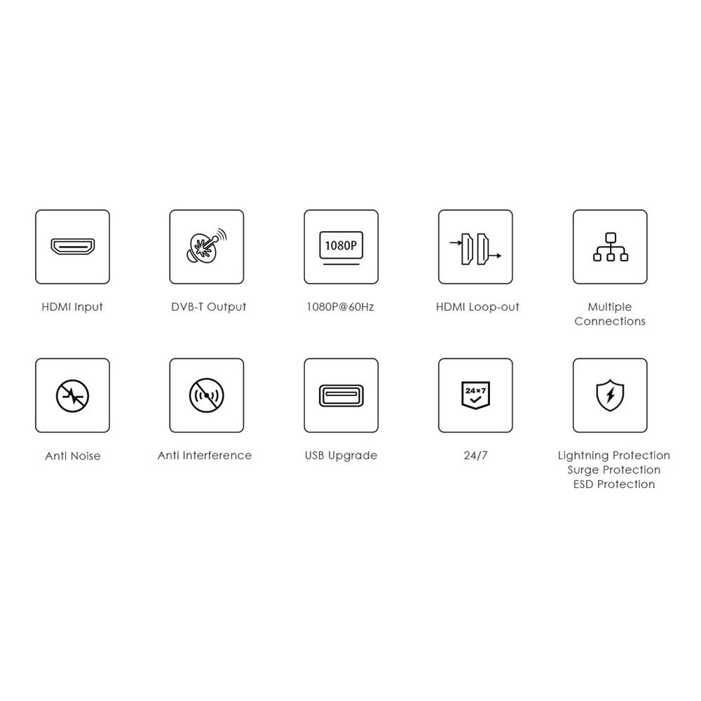 - Seamless Signal Conversion: Effortlessly transforms HDMI video/audio into a DVB-T digital television signal.