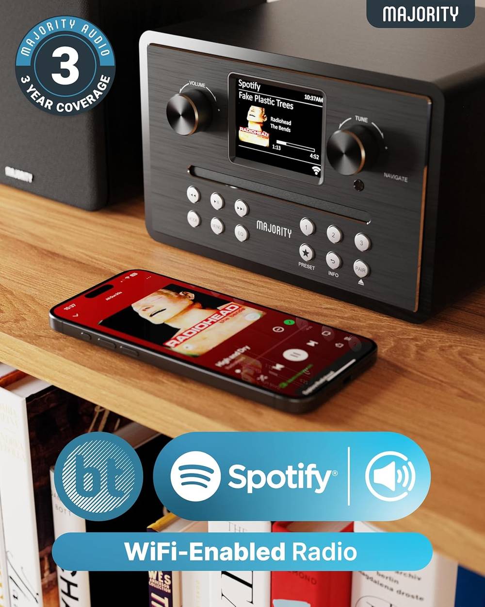 - 𝗔𝗟𝗟 𝗜𝗡 𝗢𝗡𝗘 𝗛𝗜𝗙𝗜 𝗦𝗬𝗦𝗧𝗘𝗠: Enjoy versatile playback with CD player, DAB/DAB+ digital radio, FM radio, Bluetooth 5.3 streaming, USB playback and phone charging, Internet radio, and Spotify Connect. Perfect for home audio with seamless connectivity