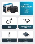 𝗪𝗛𝗔𝗧'𝗦 𝗜𝗡 𝗧𝗛𝗘 𝗕𝗢𝗫: Includes 2 x D70X active bluetooth bookshelf speakers, remote control, RCA to RCA, RCA to 3.5mm, optical and HDMI cables, speaker interconnect cable, UK power lead and user manual. Each speaker: 14.5 x 17.3 x 23 cm, weight 3.7 kg.