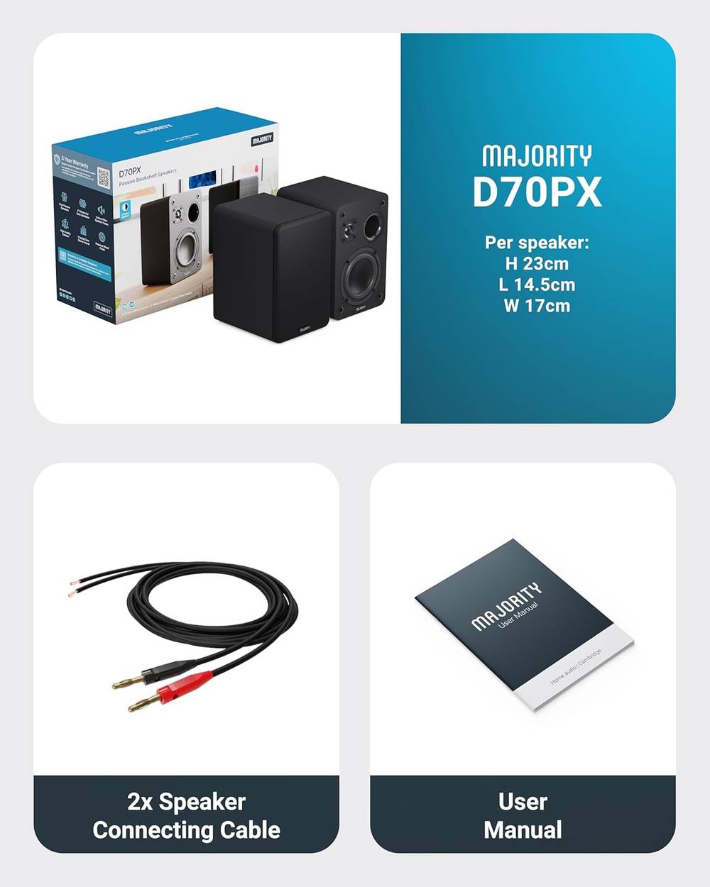 - 𝗪𝗛𝗔𝗧’𝗦 𝗜𝗡 𝗧𝗛𝗘 𝗕𝗢𝗫: This product includes 2 x Majority D70XPassive Speakers, 2 x 2-metre speaker cables (banana plug to stripped wire), and 1 x User Manual. Each speaker measures 14.5 cm (W) x 17.cm (D) x 23 cm (H) and weighs 3.6 kg