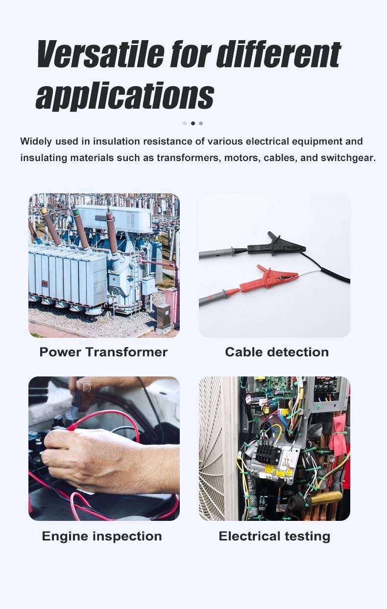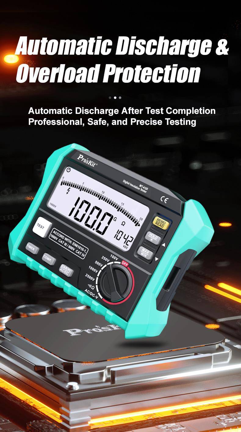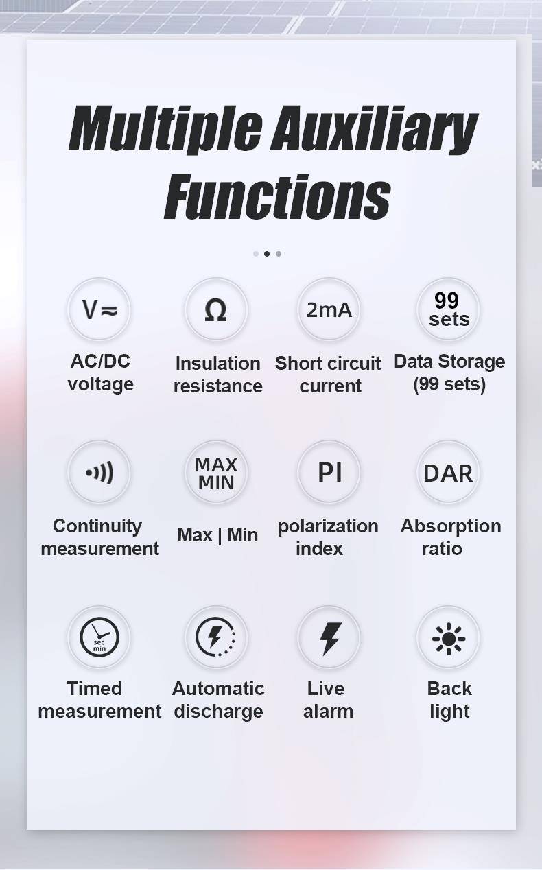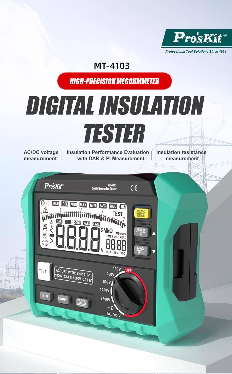 - Digital insulation meter, AC/DC voltage, insulation resistance, insulation performance evaluation with DAR and PI measurement. With a test voltage up to 2500V and a 200GΩ range, various functions include: low battery indicator, data hold, comp, pass, fail, DAR, PI, MAX/MIN, timer, memo, read, DC, AC, VDC, reverse polarity, continuity, automatic shutdown, this model meets IEC 61010-1 CAT III 1000V safety standards. It is equipped with DAR/PI insulation diagnostics, PASS/FAIL comparison, timer function, data storage and backlit display. Ideal for industrial, electrical and advanced maintenance applications