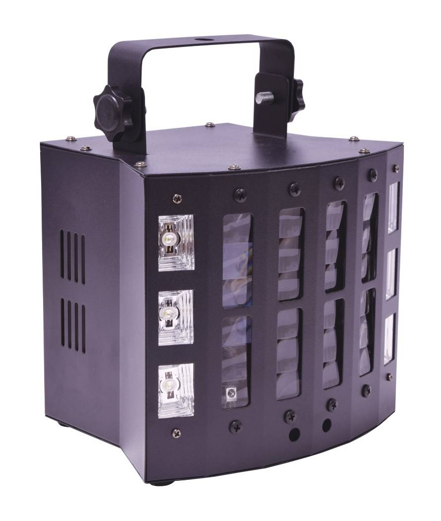 Compact lighting fixture with 4 different dynamic and colourful effects. The main derby effect is powered by 9 different colour LEDs delivering twisting beams across a wide area. Each side of the main derby window are 3 dual colour LEDs for ultraviolet washes or cool white strobe effects. Below the derby window are red and green laser apertures, which produce sharp geometric patterns directly to the front of the fixture. Internal auto and sound activated programs employ a combination of the 4 effects to produce dazzling colour displays and each function can be accessed via DMX or from the included remote control handset. A space-saving and efficient solution for mobile and installed lighting setups.