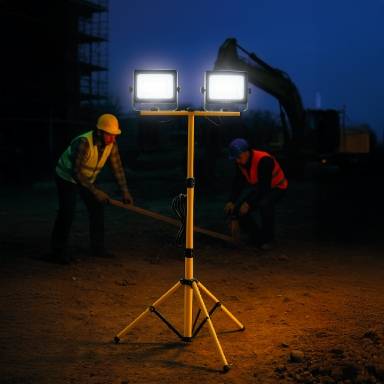 Dual 50W LED spotlights with tripod and adjustable pole (65cm to 150cm), 2.5m cable, Schuko plug, 230V~ 50/60Hz power supply. Each 50W spotlight delivers 5,500 lumens. Designed to operate even in the rain thanks to its IP65 protection rating.