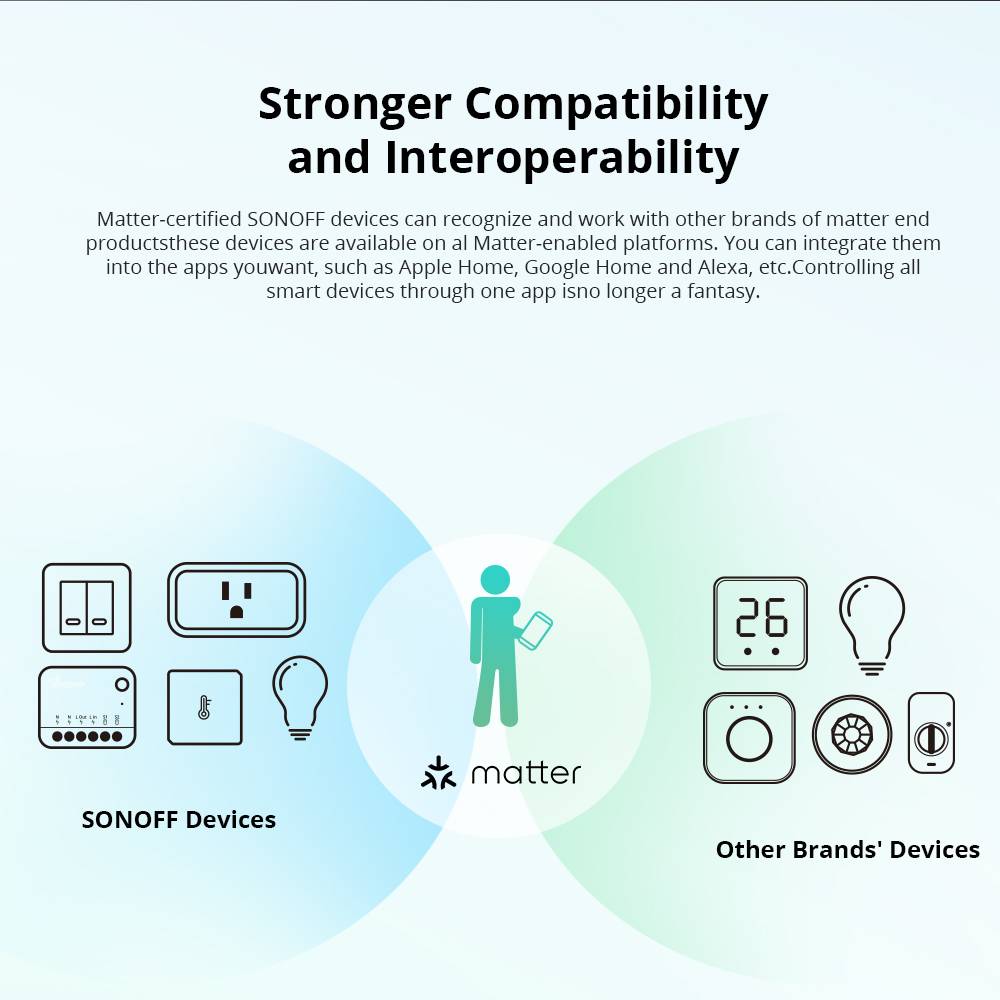 • SONOFF MINIR4M is a Matter-certified device, it can work with other brands of Matter end devices and integrate into Matter-enabled platforms, such as Alexa, Apple Home, Google Home, etc. Controlling all smart devices through one app is no longer a fantasy