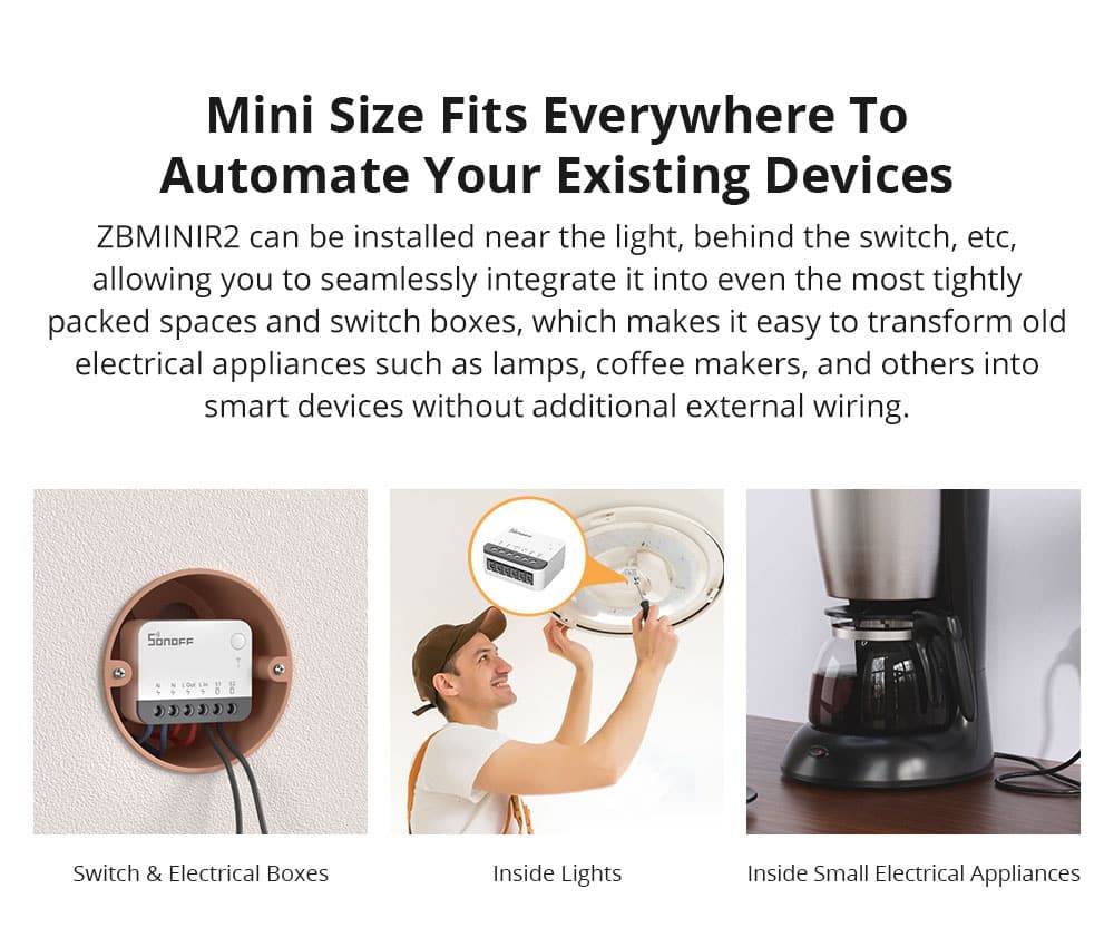 • SONOFF ZBMINIR2 is an extremely compact Zigbee 3.0 smart switch, capable of being installed in EU-type/86 type/120 type mounting box and supporting a maximum load of 10A, compatible with various external switch types, upgrading your traditional external switch into a smart one, seamlessly integrating smart technology into your home for enhanced convenience and control.