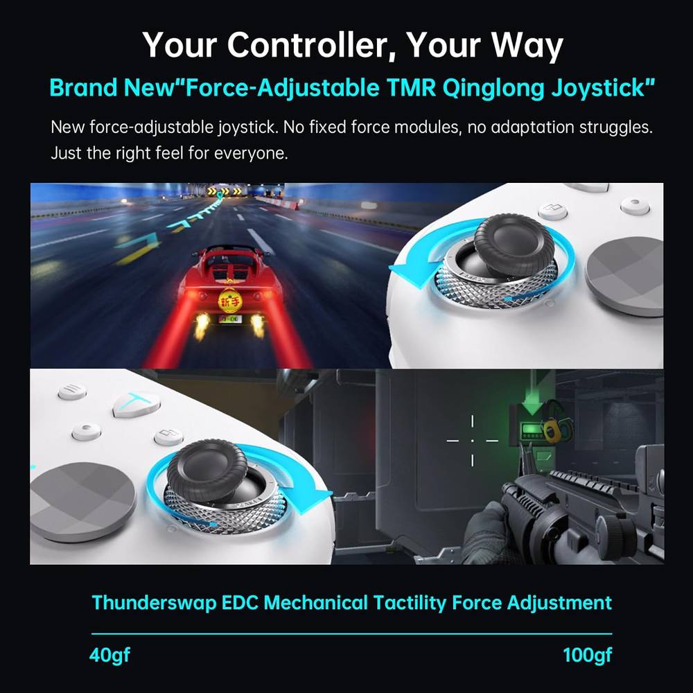 - Precision TMR Joysticks with Force Adjustment Equipped with custom TMR joysticks and a mechanical resistance dial, this controller lets you manually fine-tune joystick tension to match your exact playstyle. Whether you prefer loose control for smooth racing or tighter resistance for precision aiming, enjoy a personalized, pro-level experience that elevates every move.