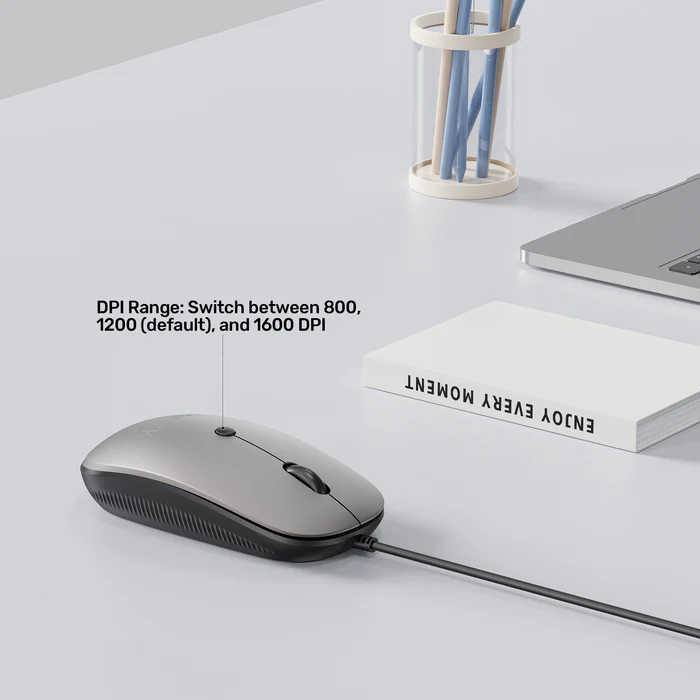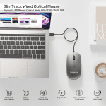 UNITEK SlimTrack Wired Optical Mouse features slim ergonomic design with multi-functional scrolling and 1600 DPI precision. Silent clicks, plug-and-play USB-A.
