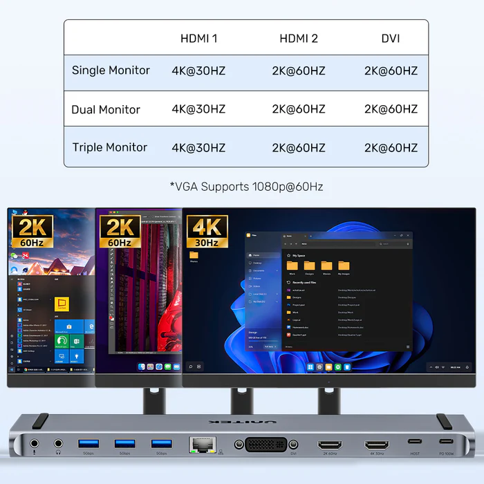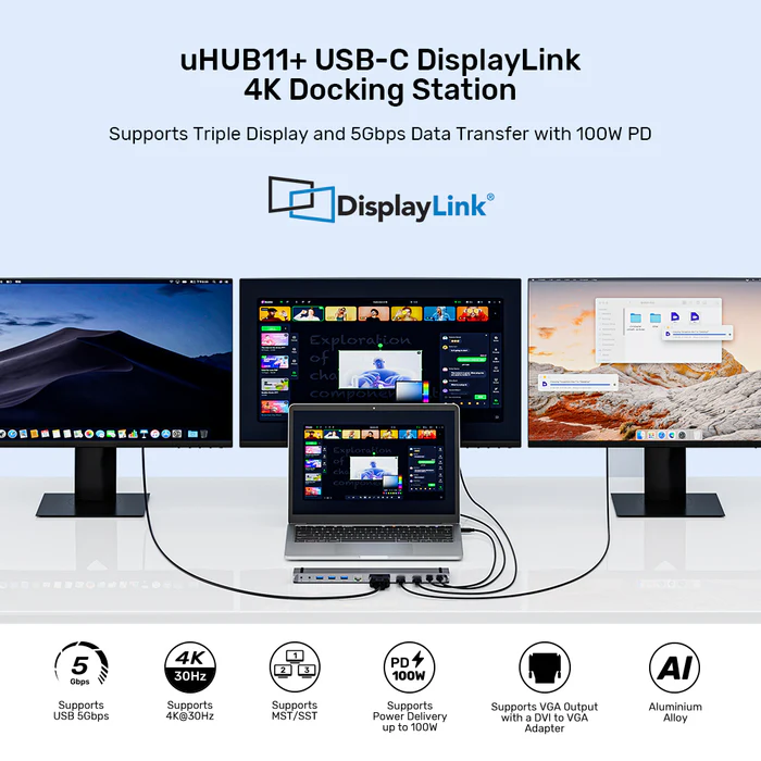 UNITEK uHUB11+ USB-C Docking Station offers triple display (4K@30Hz max), 100W PD, 5Gbps USB, and Gigabit Ethernet. Includes audio jacks, DVI/VGA adapter. Ideal for office, entertainment, and creative