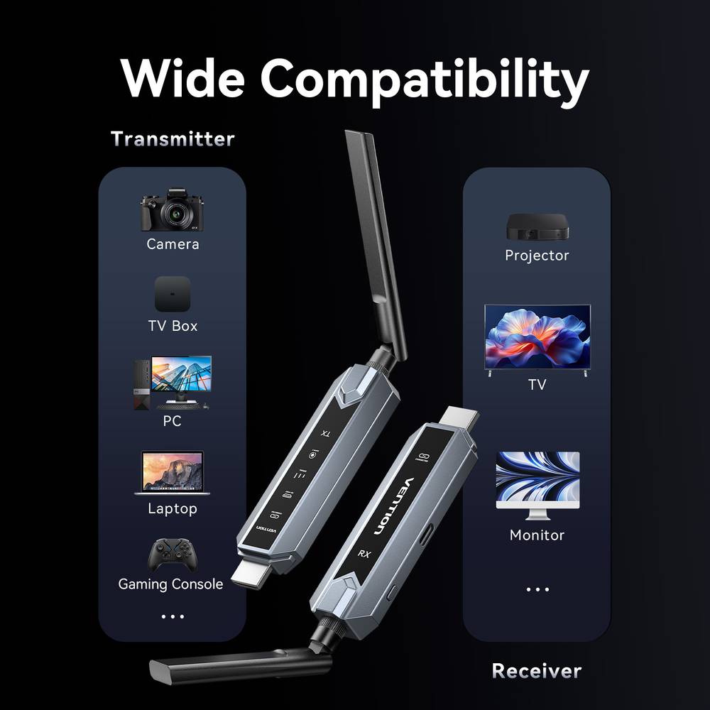 The Vention ADPH0-2 is a professional-grade wireless HDMI kit designed to split a single 1080p video source to two separate displays simultaneously without the need for long, messy cables. It is often used in conference rooms, classrooms, or home theaters where you need to mirror content across multiple screens.