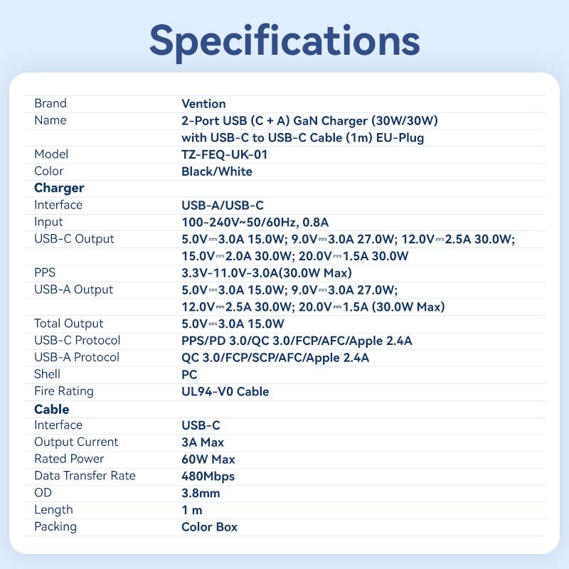 Be the first to review “Vention Charger Wall GaN 30W 1xA 1xC+USBC Cable White TZ-FEQW0-UK-01”
