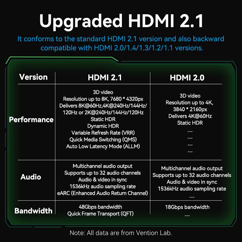 The Vention HDMI Cable 2.1 appears to be a high-speed HDMI cable designed for modern home entertainment and gaming setups