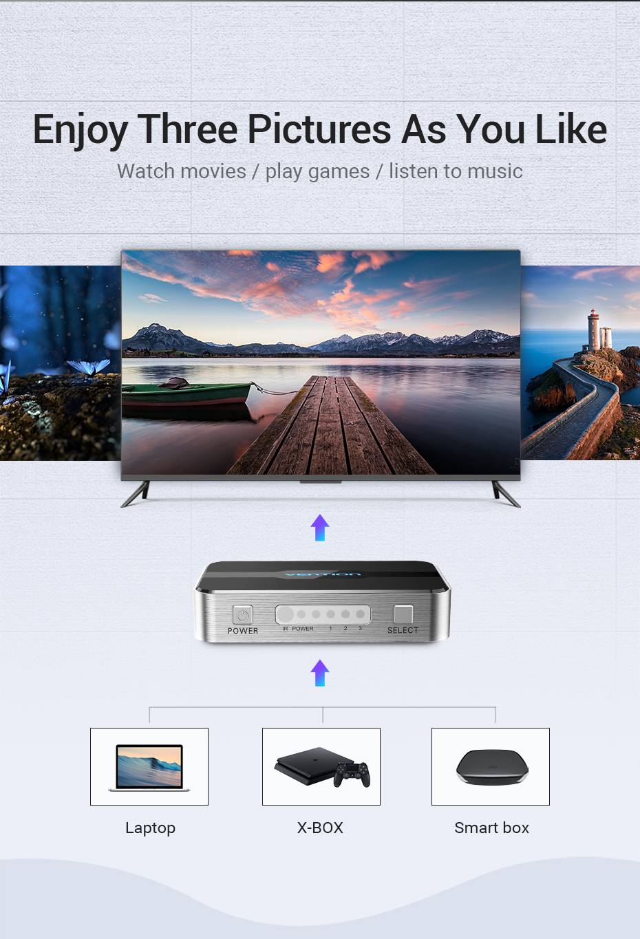 The HDMI switch box allows you to input 3 HDMI sources to 1 TV/Display/Monitor. It will automatically switch to the latest detected HDMI source seamlessly to save you trouble in switching your display to your device.