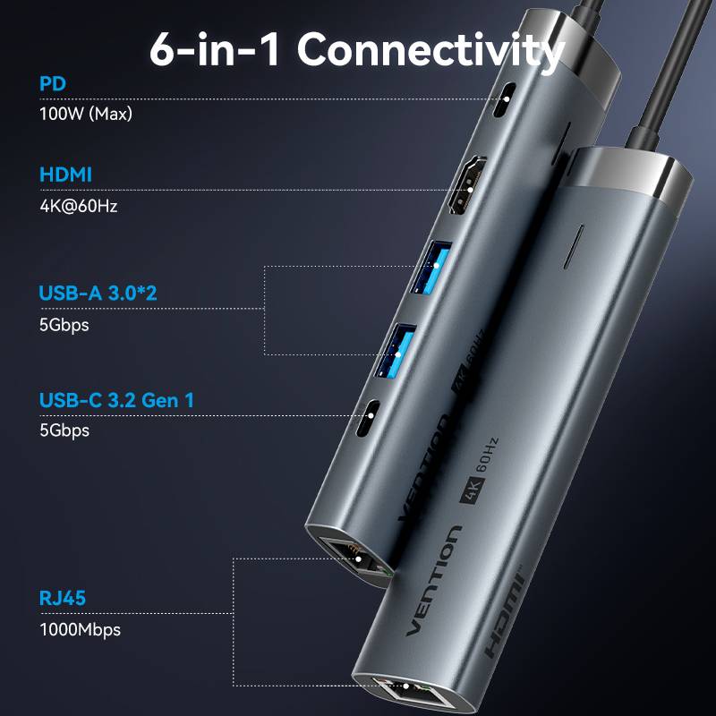 The Vention TGNHB is a streamlined 6-in-1 USB-C hub. It is effectively a "Pro" version of a standard travel hub because it supports 4K @ 60Hz and Gigabit Ethernet, making it ideal for users who prioritize smooth video and fast internet without the bulk of SD card readers or audio jacks.