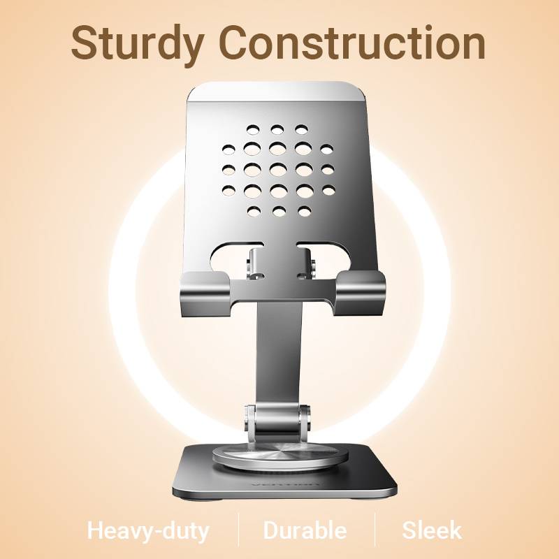 The Vention KSDH0 Desktop Stand is a premium, heavy-duty mounting solution designed for resellers targeting the ergonomic workspace and home-office markets. Crafted from high-grade aluminum alloy, this stand offers rock-solid stability for both smartphones and tablets up to 12.9 inches. Its standout feature is the 360° rotatable base, which provides a satisfying mechanical "click" and allows users to share their screen effortlessly during meetings or collaborations. The dual-axis folding design ensures it can be adjusted to the perfect eye-level height to reduce neck strain, or folded completely flat for maximum portability.