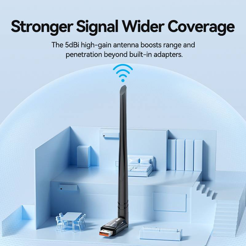 - High-Gain Antenna: The external "shark fin" style antenna provides superior wall penetration and a longer range, making it ideal for rooms far from the router.