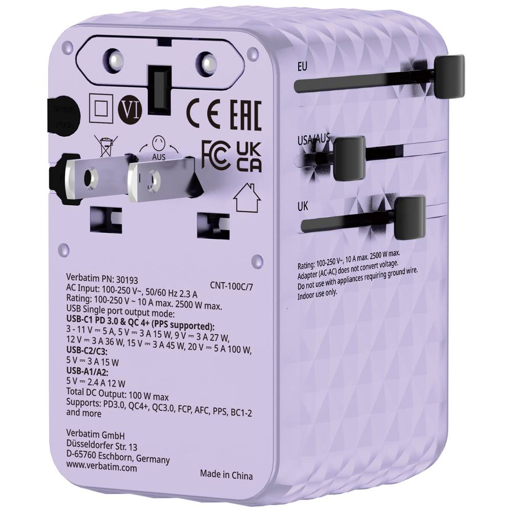 Verbatim Charger Travel Adapter 100W 2xC 2xA 1xRetractable USB-C Purple