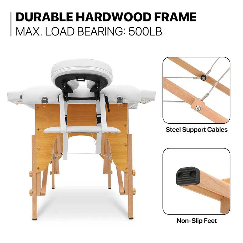 Sturdy wooden frame with premium PVC leather – waterproof and resistant to massage oils and disinfectants. Easy to clean and built to last for years of daily use!